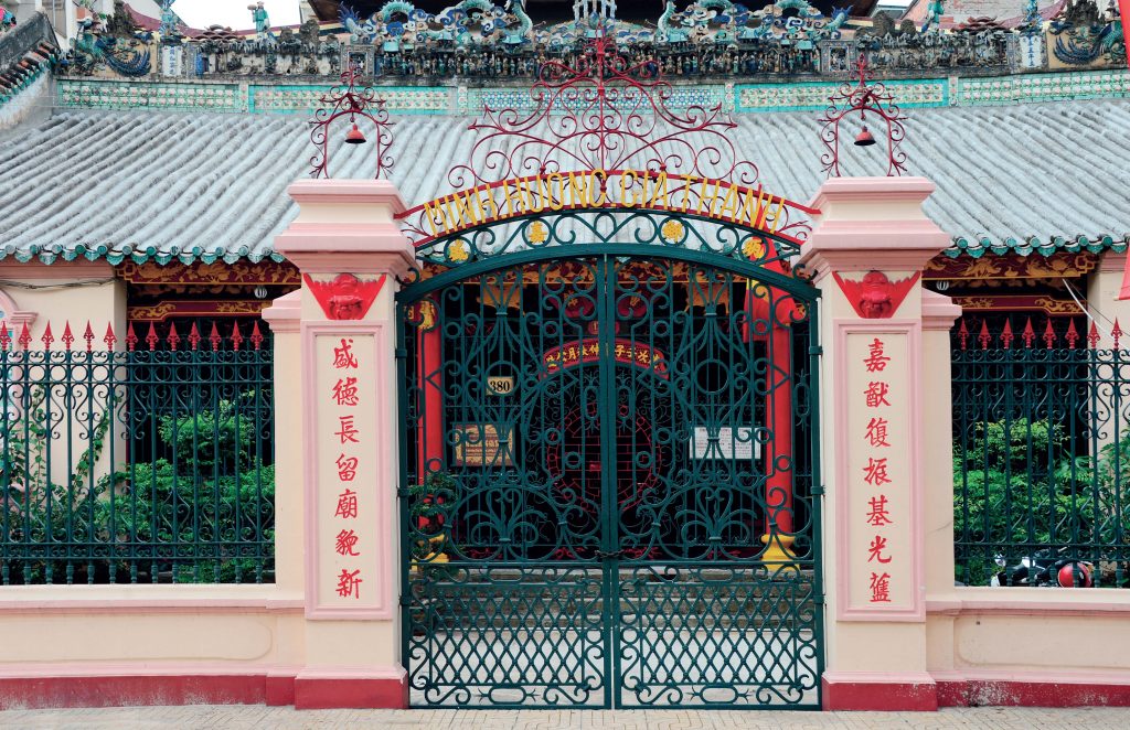 Chi tiết kiến trúc và trang trí Đình Minh Hương Gia Thạnh mang những nét hòa hợp, với cổng sắt mang phong cách chế tác mỹ nghệ đậm ảnh hưởng Tây Âu, kết nối rất mở với không gian nội thất đậm nét Á Đông của đình.