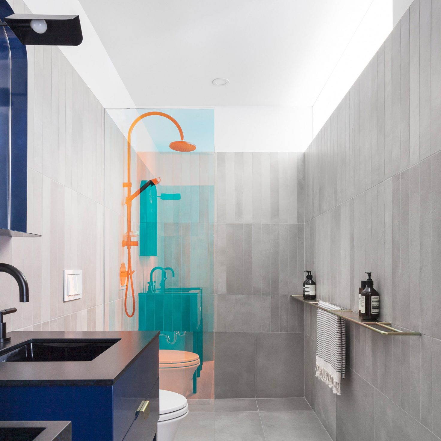 Với tông xám nhẹ làm nền, căn phòng tắm tại Montreal dễ dàng tạo ấn tượng với tông màu chói, rực rỡ xuất hiện trên các thiết bị, vật dụng quen thuộc. Sự xuất hiện của các cặp màu có phần tương phản hoàn toàn không gây khó chịu mà còn giúp thị giác dễ dàng định hình được yếu tố chính – phụ trong thiết kế.