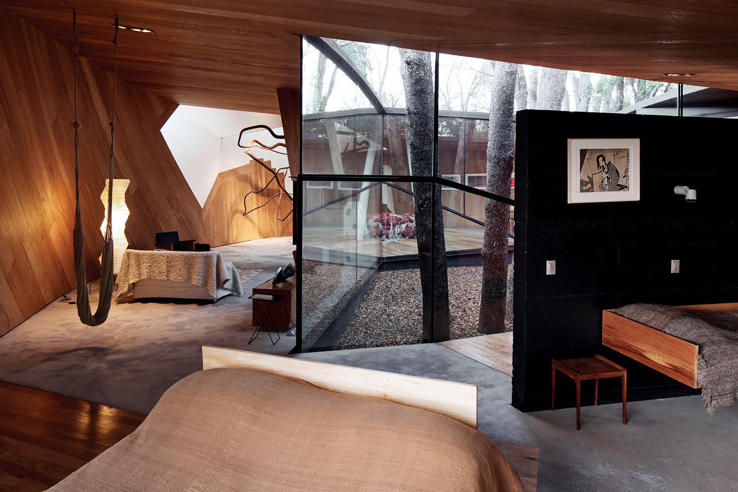 Không gian nội thất bên trong ngôi nhà bê tông đen là sự tương phản mạnh mẽ khi hầu hết các diện vách đều ốp bằng gỗ tuyết tùng gợi nên cảm giác ấm áp, tự nhiên và đặc biệt là hòa nhập cùng cảnh quan bao bọc xung quanh. Lớp vật liệu ấy kết hợp cùng khoảng không gian mở được bố trí khéo léo tạo nên sự hoành tráng, mang đến những trải nghiệm thiên nhiên khó quên ngay bên trong công trình.