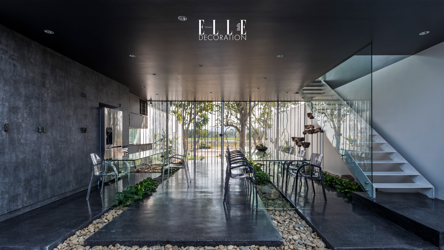 Hệ thống cây xanh và sỏi đá phủ kín từ vườn vào nhà, “xâm lấn” một phần diện tích mặt bằng tầng 1, xóa bỏ ranh giới trong – ngoài. Ảnh: Hiroyuki Oki