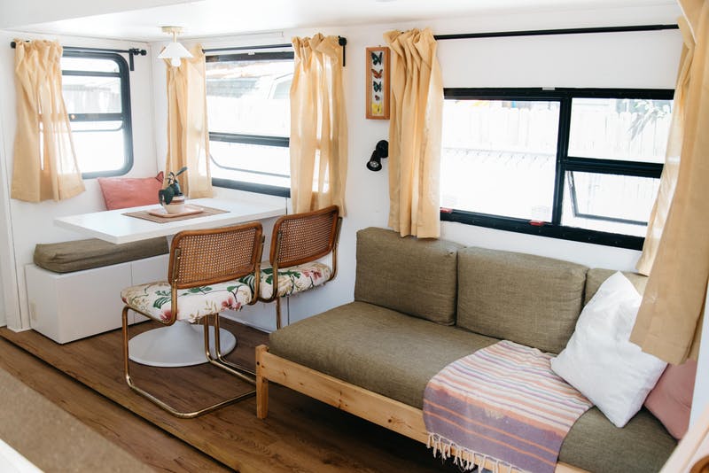 Bằng cách tự thực hiện nhiều công đoạn như chà nhám, sơn sửa, bọc vải, cắt gọt khung giường,… những vị chủ nhân của ngôi nhà nhỏ Tiny Gutted RV đã tạo nên không gian sống cho riêng mình với nhiều tiện ích và bỏ qua sự bất tiện về diện tích sử dụng hạn chế.