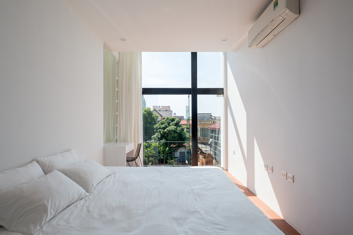 Đen (thép) – Trắng (tường) – Đỏ (đất nung) là ba yếu tố vật liệu xuyên suốt nội – ngoại thất công trình. Bạn có thể cảm nhận trọn vẹn sự thay đổi ánh sáng trong ngày thông qua không gian gần như rỗng ở tầng một và thắt lại, chia nhỏ nhưng hợp lý ở các căn hộ tầng trên.