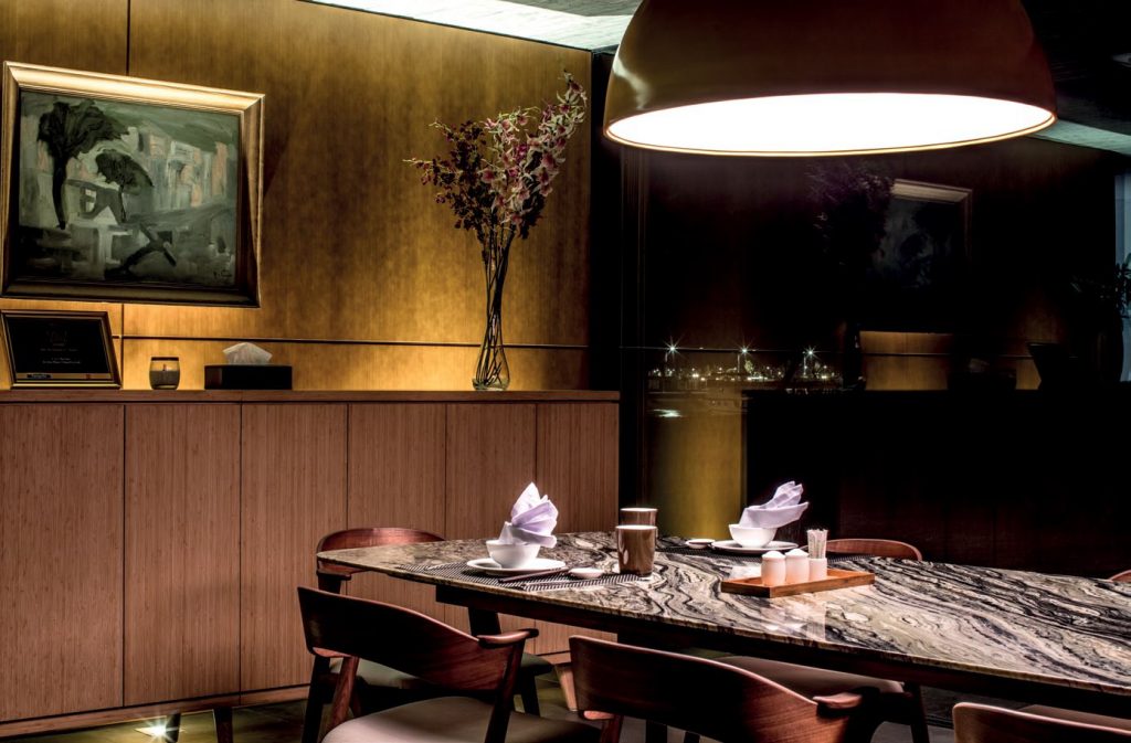 Nội thất gỗ tinh tế, bàn đá marble tinh xảo, kết hợp cùng ánh sáng ấm áp làm nên sự sang trọng của phòng ăn.