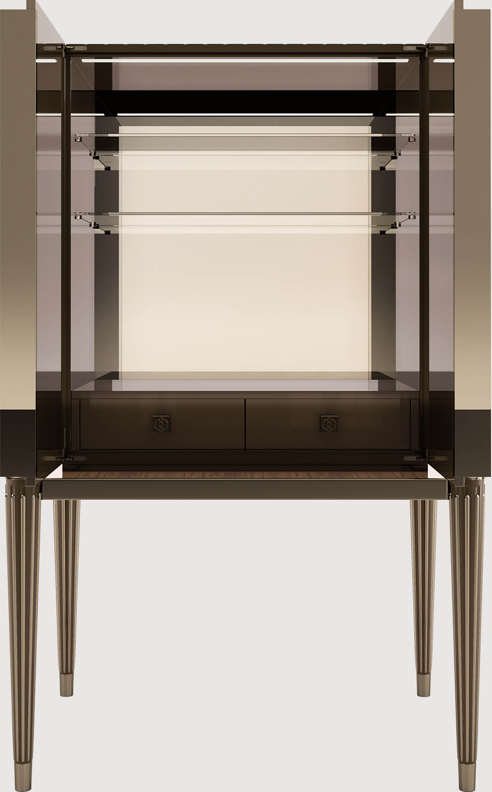 Chiếc tủ của thương hiệu thiết kế và chế tác nội thất cao cấp Ý Bruno Zampa thể hiện nghệ thuật bọc da ở mức độ tinh xảo qua chi tiết may chần thủ công tỉ mỉ trên cánh cửa. Vẻ sang trọng được nâng tầm nhờ sự kết hợp tinh tế giữa các chi tiết kim loại mạ đồng ấm áp và lớp veneer từ những loại gỗ quý hiếm như Mun Macassar Ebony hay Bạch Đàn. Bên trong, không gian được bài trí gọn gàng và thông minh với hệ thống kệ kính, ngăn kéo được sắp xếp hợp lý, cùng một mặt gương rộng không chỉ phục vụ nhu cầu sử dụng mà còn khéo léo tạo ra chiều sâu thị giác, làm rộng mở không gian.