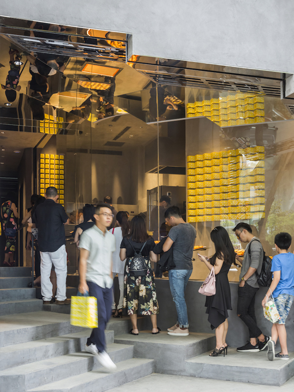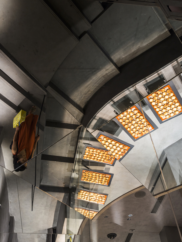 Sàn cửa hàng theo từng bậc cao hơn mặt đường 400mm. Do sự chênh lệch đó, những chiếc bánh Bake cheese tart sẽ khó nhìn hơn từ bên ngoài. Để khắc phục điều này, cầu thang gương đã được thiết kế trên trần để phản chiếu những chiếc bánh tart mà người đi đường vẫn có thể nhìn thấy.