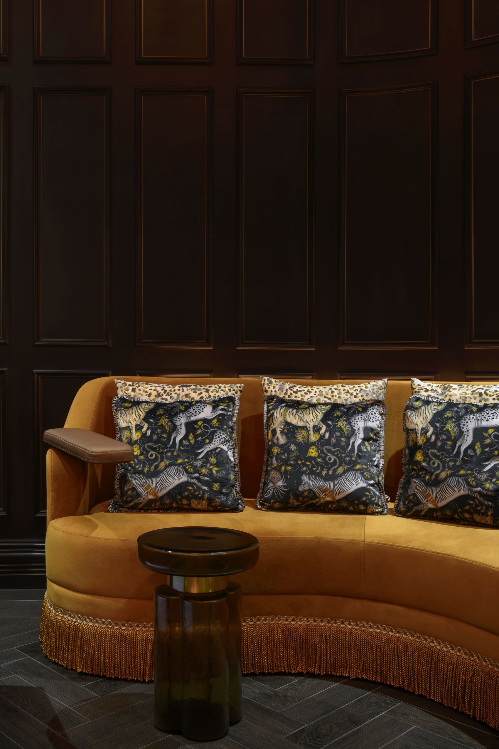 Khu vực tiếp khách VIP được bố trí ghế sofa bọc nhung màu vàng nổi bật trên nền sơn tường đen. Bộ gối tựa bọc vải họa tiết động vật sinh động.